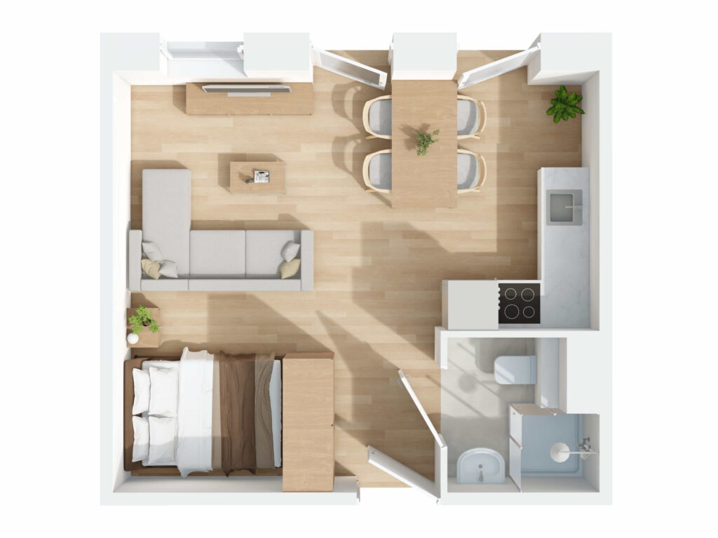 De 17 appartementen | studio’s zijn ontworpen met oog voor comfort en duurzaamheid. Dankzij het gebruik van onderhoudsarme materialen en slimme energieoplossingen profiteer je van lage energiekosten en weinig onderhoud. Grote openslaande deuren en draai-kiepramen zorgen voor een lichte en frisse woonbeleving. Daarnaast biedt het gezamenlijke dakterras een fijne plek om te ontspannen en mede-bewoners te ontmoeten.